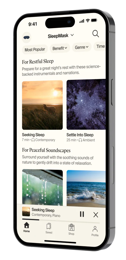 Gå lenger enn mørklegging med SleepMask. Vår ultrakomfortable sovemaske med 100 % mørklegging har 3 stille, beroligende vibrasjonsmønstre som er vitenskapelig bevist å hjelpe deg med å sovne raskere, sove lenger, få dypere søvn og våkne færre ganger i løpet av natten.